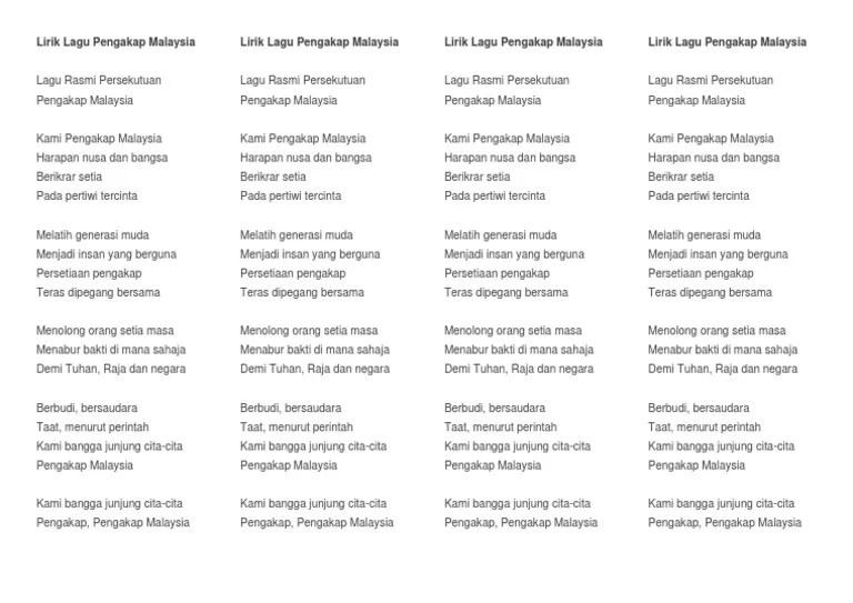 Kami pengakap malaysia harapan nusa dan bangsa berikrar setia pada pertiwi tercinta. Lagu pengakap malaysia dengan lirik youtube. Lagu pengakap malaysia · disini senang disana senang · ag suryaputra tempat kita bernyanyi · more videos · more videos on youtube · happy yee yee & . Lagu rasmi persekutuan pengakap malaysia. Lirik lagu rasmi persekutuan pengakap malaysia . Kami pengakap malaysia harapan nusa dan bangsa. Melatih generasi muda menjadi insan yang berguna . Lagu pengakap malaysia kami pengakap malaysia harapan nusa dan bangsa berikrar setia pada pertiwi tercinta melatih generasi muda menjadi insan yang berguna .